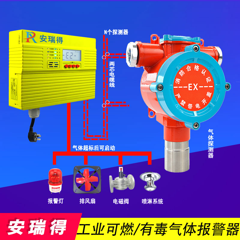 可燃有害氣體報(bào)警器可以有效的檢測(cè)出可燃有毒性氣體的濃度,預(yù)防氣體泄漏后可燃有毒性氣體濃度超標(biāo)。可燃有害氣體報(bào)警器是由氣體報(bào)警控制器和氣體探測(cè)器兩部分組成,控制器可放置于值班室內(nèi),主要對(duì)各監(jiān)測(cè)點(diǎn)進(jìn)行控制,可燃有毒性氣體探測(cè)器安裝于氣體zui易泄漏的地點(diǎn),氣體探測(cè)器的核心部件為內(nèi)置的氣體傳感器,可燃?xì)怏w傳感器檢測(cè)空氣中可燃?xì)怏w的濃度。氣體探測(cè)器將傳感器檢測(cè)到的可燃?xì)怏w濃度轉(zhuǎn)換成電信號(hào),通過線纜傳輸?shù)娇刂破鳎扇加卸拘詺怏w濃度越高,電信號(hào)越強(qiáng),當(dāng)氣體濃度達(dá)到或超過氣體報(bào)警控制器設(shè)置的報(bào)警點(diǎn)時(shí),氣體報(bào)警控制器發(fā)出報(bào)警信號(hào),并可啟動(dòng)電磁閥、排氣扇等外聯(lián)設(shè)備,自動(dòng)排除隱患。