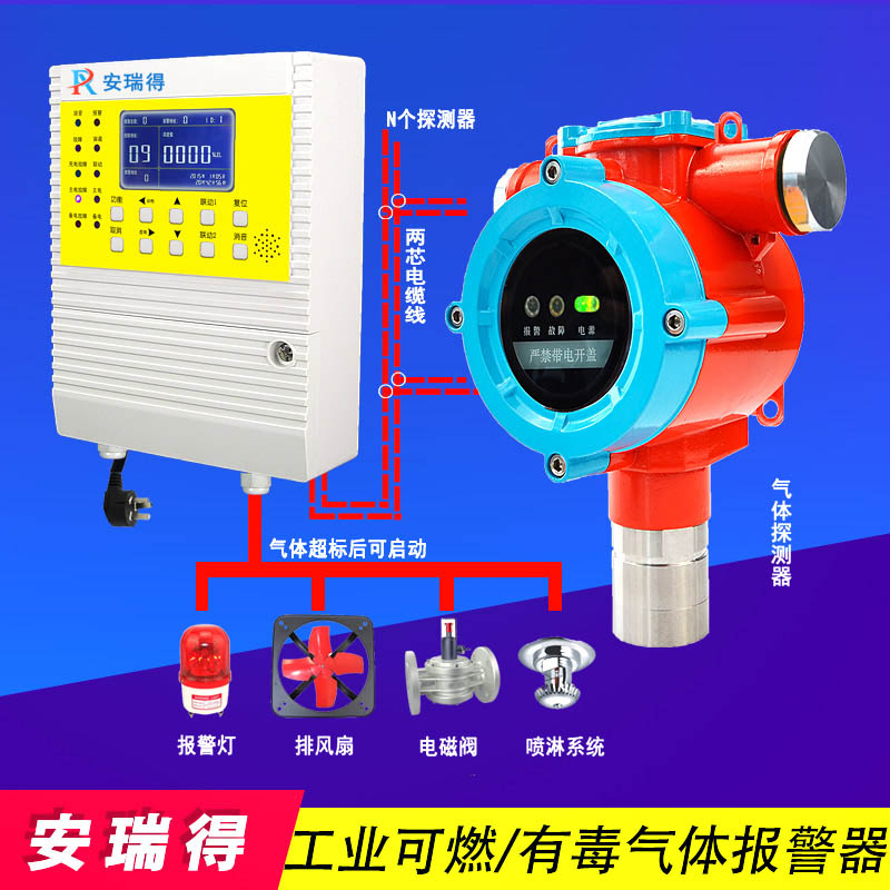 丙烯腈氣體報警器可以有效的檢測出可燃有毒性氣體的濃度,預(yù)防氣體泄漏后可燃有毒性氣體濃度超標。丙烯腈氣體報警器是由氣體報警控制器和氣體探測器兩部分組成,控制器可放置于值班室內(nèi),主要對各監(jiān)測點進行控制,可燃有毒性氣體探測器安裝于氣體zui易泄漏的地點,氣體探測器的核心部件為內(nèi)置的氣體傳感器,可燃氣體傳感器檢測空氣中可燃氣體的濃度。氣體探測器將傳感器檢測到的可燃氣體濃度轉(zhuǎn)換成電信號,通過線纜傳輸?shù)娇刂破鳎扇加卸拘詺怏w濃度越高,電信號越強,當氣體濃度達到或超過氣體報警控制器設(shè)置的報警點時,氣體報警控制器發(fā)出報警信號,并可啟動電磁閥、排氣扇等外聯(lián)設(shè)備,自動排除隱患。